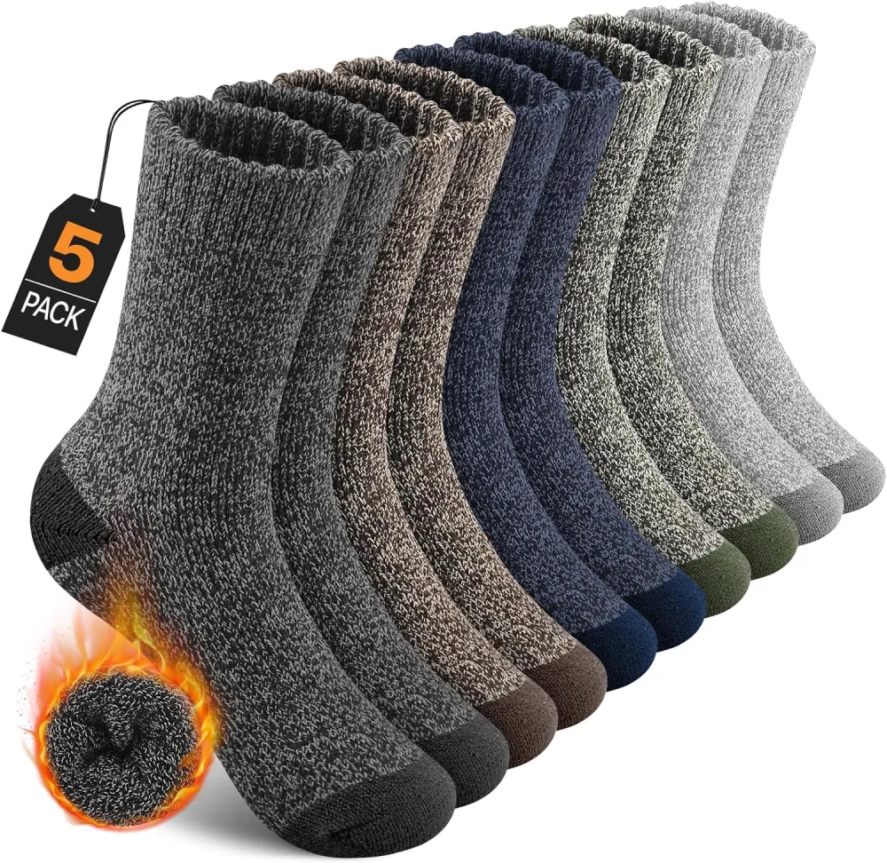 5 Pairs Merino Wool Socks for Men, Thermal Wool Hiking Socks Supper Thick Winter Crew Socks (US Size 7-13)