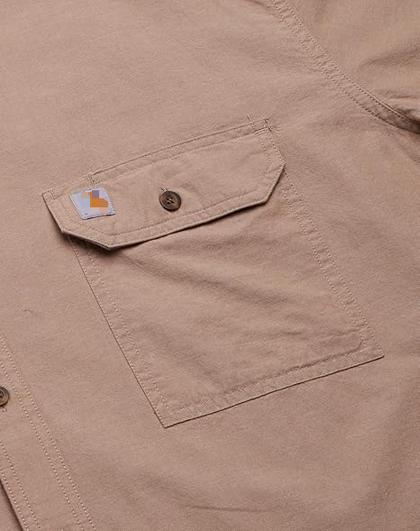 Symmetrical patch pocket design on the chest, with a buttoned lid for decoration and practicality, suitable for storing small items; The brand's iconic woven label is sewn above the pocket, highlighting the lineage of the workwear.